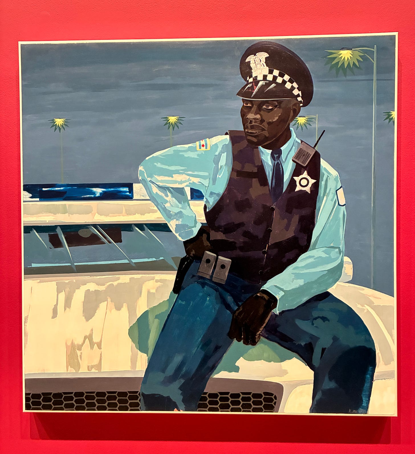 And from “Painting of Modern Life II” there is a proud cop, a work dated from right after the buzzwords “defund the police” entered the then-current political lexicon.