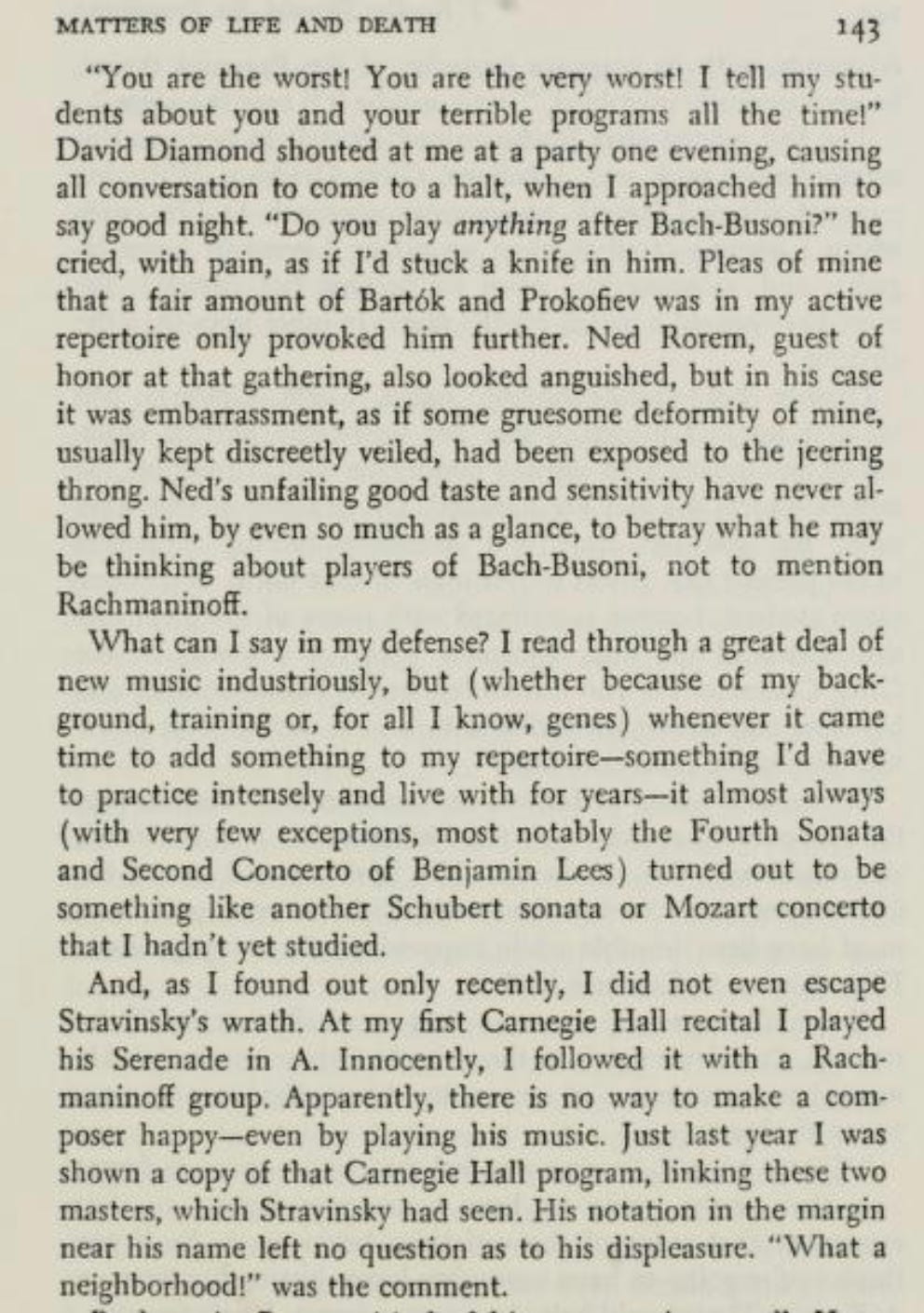 At the time of his first ascent, Graffman did not program much modern music, and from this vantage point it seems rather a pity that so little midcentury repertoire is represented in his discography alongside conventional LP recitals of Chopin, Schubert, Liszt, and etc.: Indeed, the only American composer recorded by Graffman in the early years was the somewhat obscure Benjamin Lees. An amusing page from I Really Should Be Practicing confronts this topic head on: